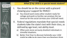 The Clifton presentation was appalling. I haven't been able to get a copy of the presentation given to parents, but here is a link to the presentation she gave to Clifton students. A dad who was at the parent presentation audio taped it. He also blogged about it. You can read and listen to it here. The presentation was delivered in an angry tone, she made incredible claim after claim in an attempt to scare parents into letting their children take the PARCC tests. When asked for citations to back up her claims, parents were chided for having "opinions" and that in the 50 times she had delivered this particular presentation (no citation for that claim either), no one had ever asked for citation. Basically, her answer to any question was to bugger off.